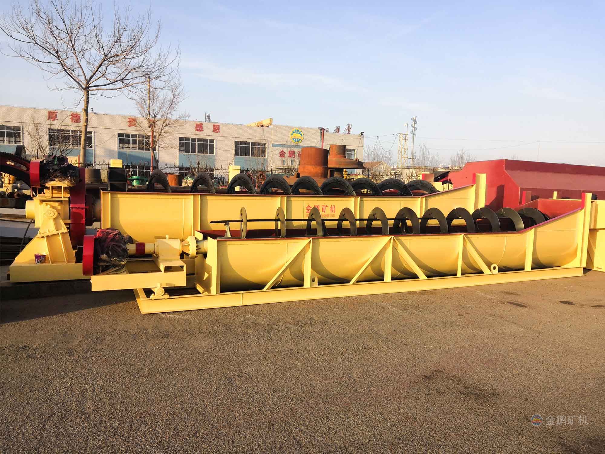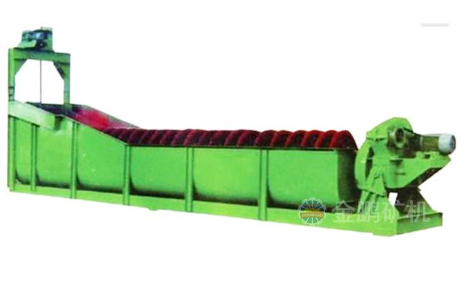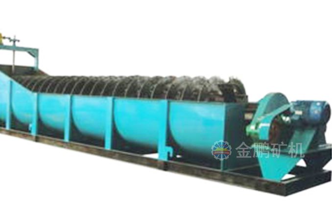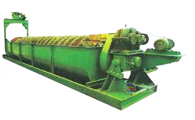 沉沒式螺旋分級(jí)機(jī)是借助于固體粒大小不同、比重不同,因而在液體中的沉降速度不同的原理,細(xì)礦粒浮游在水中由溢流堰溢出,粗礦粒沉于槽底,由螺旋推向上部排出,來進(jìn)行機(jī)械分級(jí)的一種分級(jí)設(shè)備。通過螺旋低速轉(zhuǎn)動(dòng),對(duì)礦漿起攪拌作用使細(xì)顆粒懸浮到上面,流到溢流堰處溢出,粗顆粒沉到槽底,由螺旋輸送到排料口作為返砂排出。